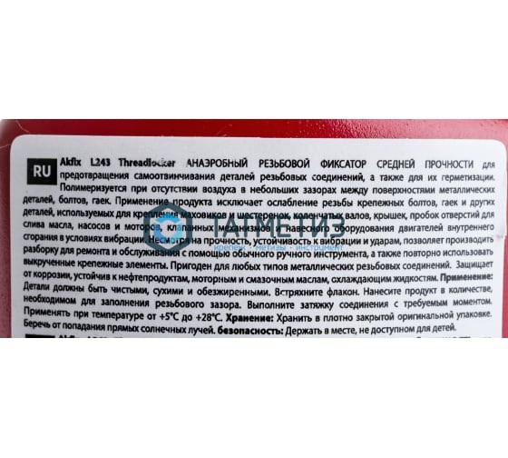 Анаэробный фиксатор резьбы средней прочности Akfix L243 50 мл, L243_01 предназначен для надежной фиксации метрических и стандартных гаек и болтов (монтажные болты, корпусные винты). Состав затвердевает при отсутствии воздуха между плотно прилегающими металлическими поверхностями. Продукт предотвращает коррозию собранных деталей, ослабление вибрации и утечки через резьбу.